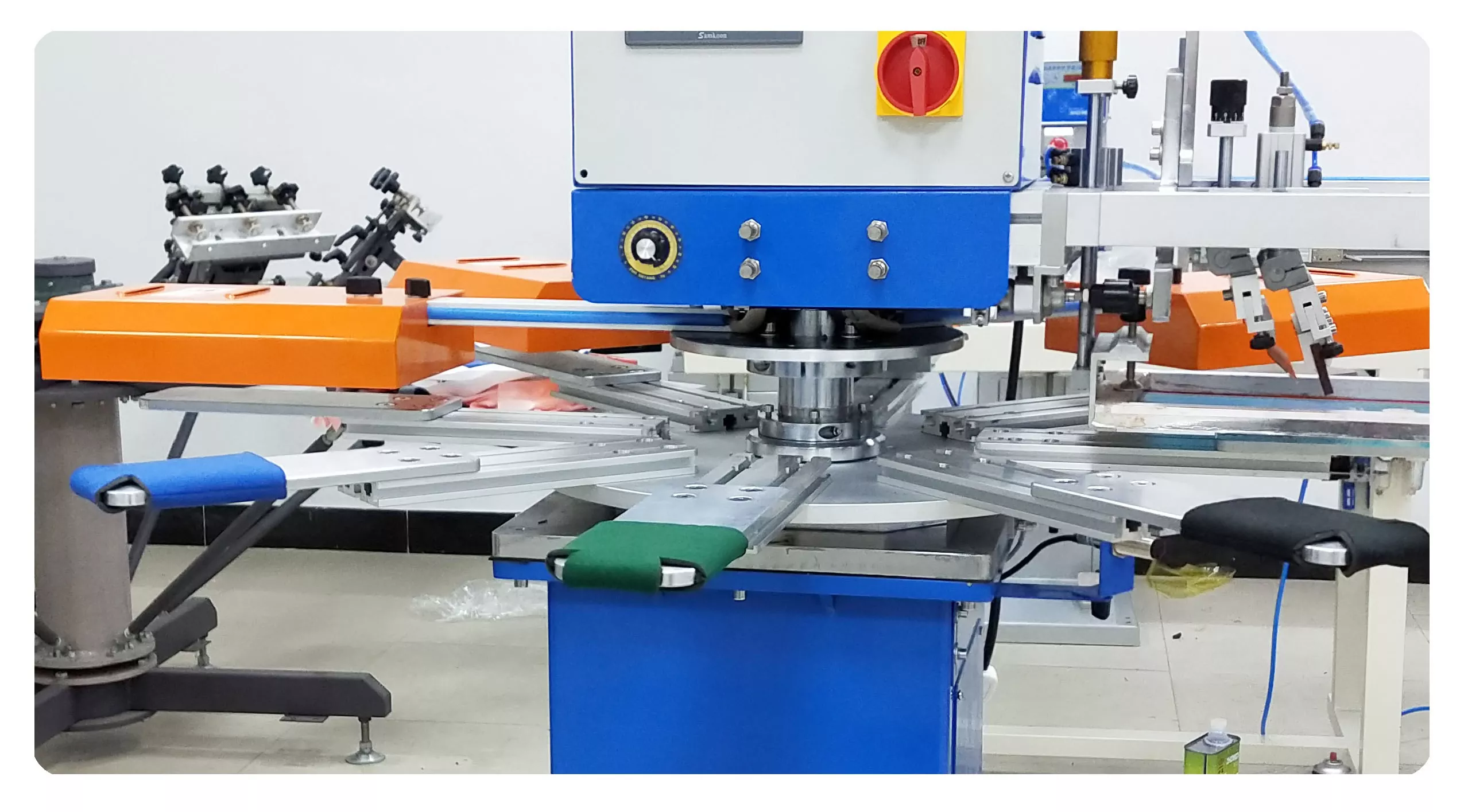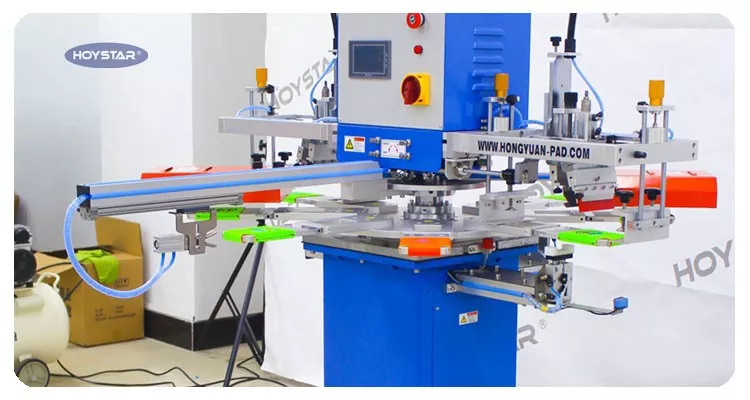 5. Meja kerja putar mencakup delapan stasiun: satu untuk memuat, satu untuk mencetak, dua untuk mengeringkan, dan satu untuk membongkar, memungkinkan lima stasiun bekerja pada waktu yang sama.